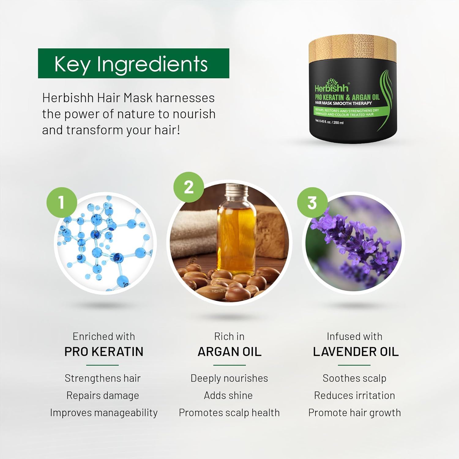 - PROFESSIONAL TREATMENT FOR DRY DAMAGED & COLOR TREATED HAIR โ Give your lush locks the care they deserve with Herbishh keratin argan oil hair mask that helps repair and condition your hair from damages caused by years of color treatment and straightening, restore the softness, bounce, and shine, and nourish the hair deeply to prevent it from drying out, and give your hair lasting protection.