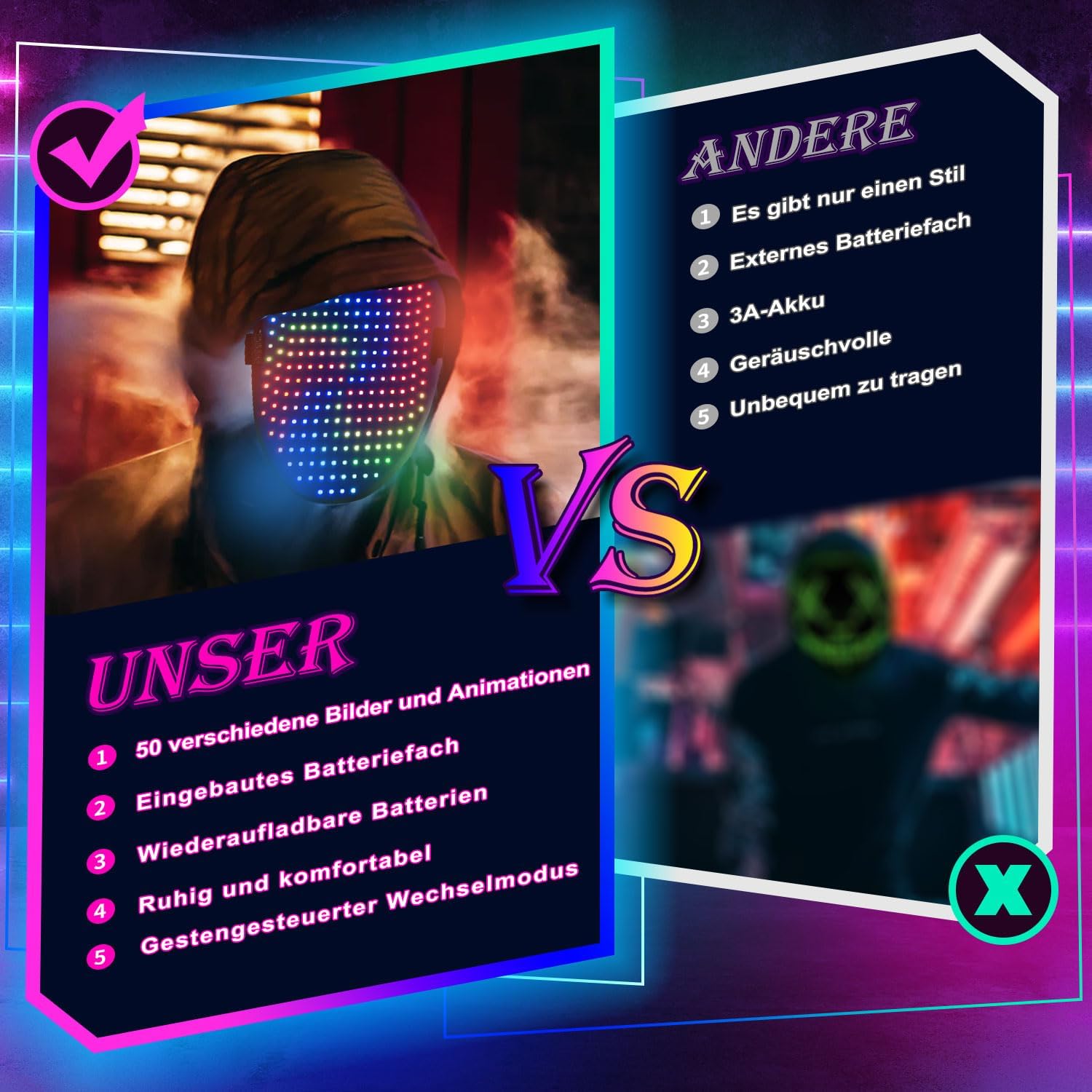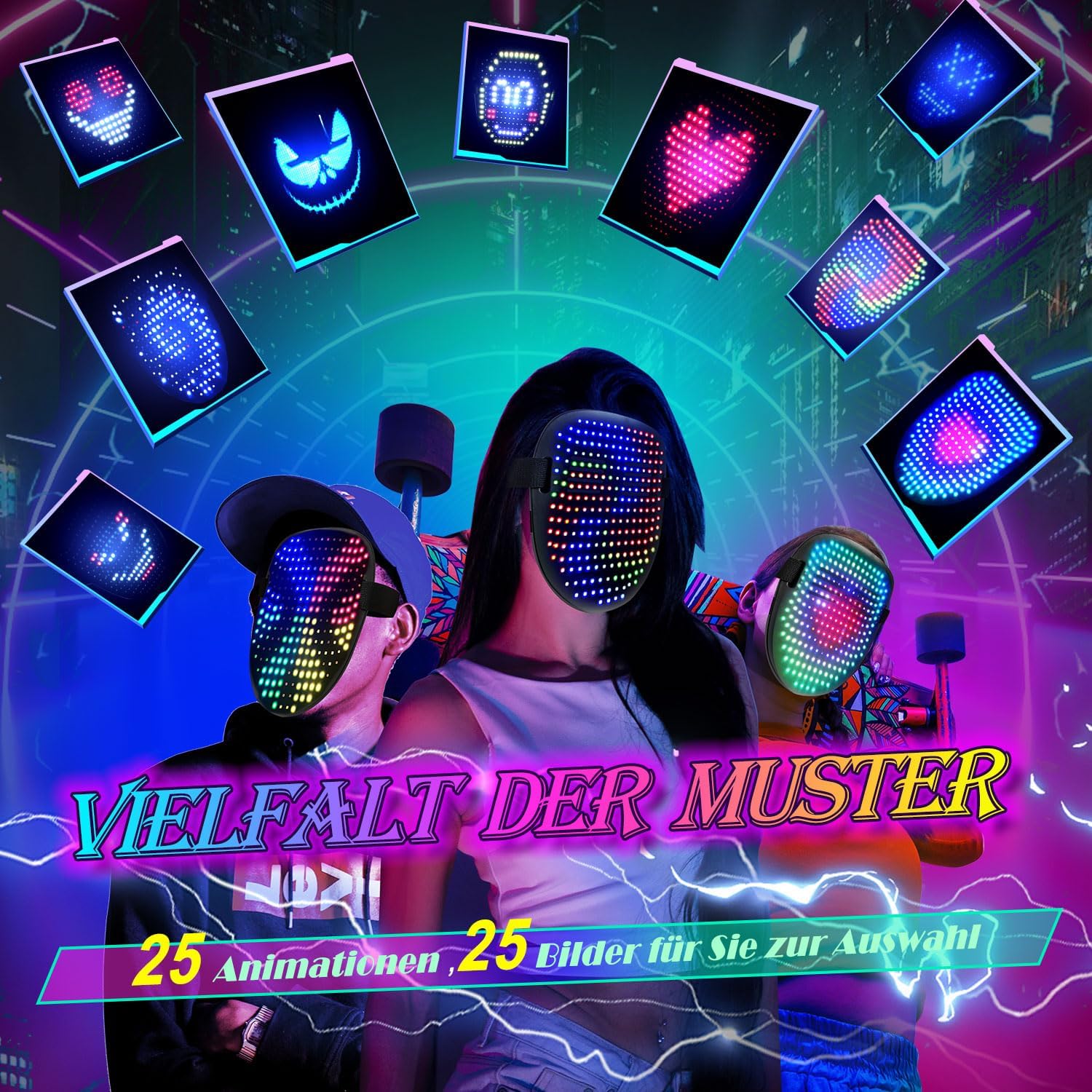 - Dynamic 50 Pattern Display: Our Led mask boasts an impressive 50 pattern display, allowing you to easily switch between dynamic display modes to match your mood and occasion.Whether it's a birthday, Halloween,Christmas,rave,or electronic music festival,Rechargeable light up mask is perfect for any occasion,Cool gifts for boys to make you the center of attention.