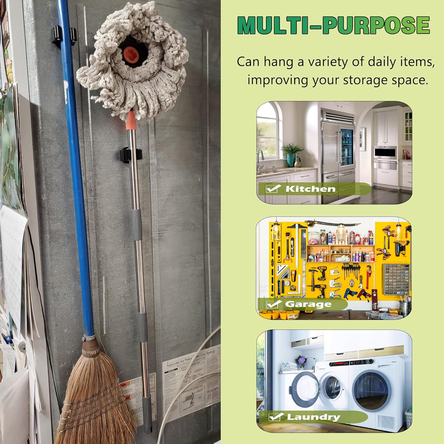 - [Multi-purpose Magnetic Mop Clip]: This mop holder can be widely used for storage to keep your laundry, garden, garage clean and tidy. From umbrellas, mops, shovels, brooms to gardening or hardware tools, we can use this holder to hold them all