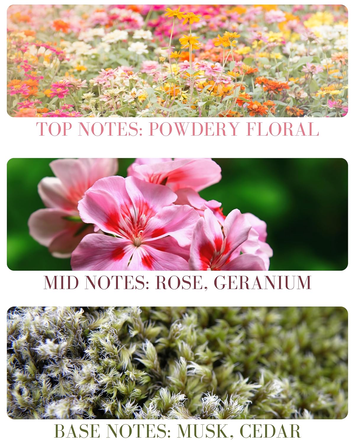 - SCENT PROFILE - Top: Powdery floral Mid: Rose, Geranium Base: Musk, Cedar. Not quite the scent of a newborn’s head, but maybe the next best thing. Powdery floral notes of rose, geranium, ylang ylang and patchouli with just a dust of cedarwood and musk.