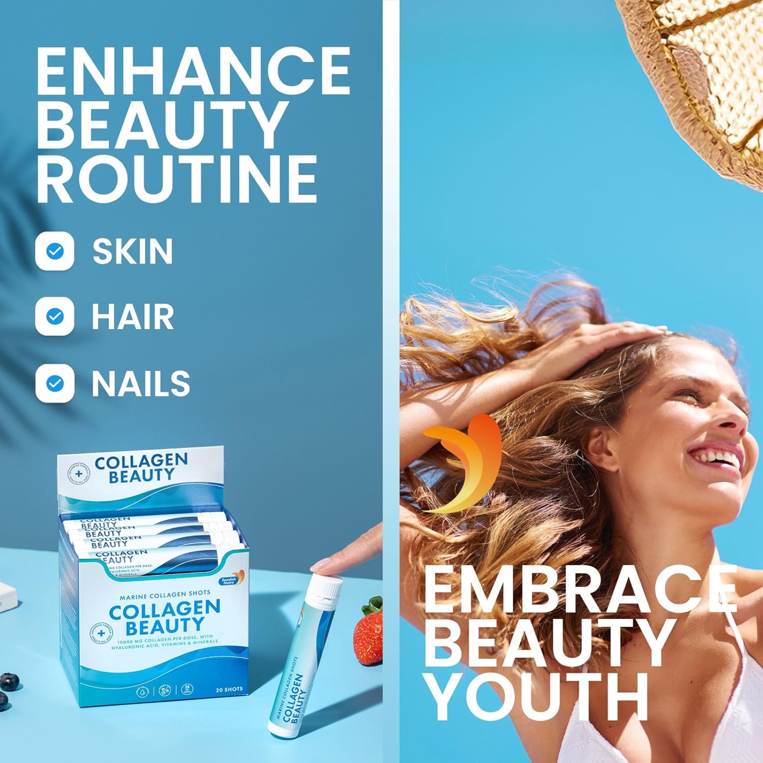 Swedish Nutra - Collagen Beauty | 10,000 mg Hydrolyzed Marine Collagen Liquid Supplement - 20 x 25 ml Daily Shots | Hyaluronic Acid and Vitamin C to Support Healthy Hair, Skin, Nails | Sugar-Free