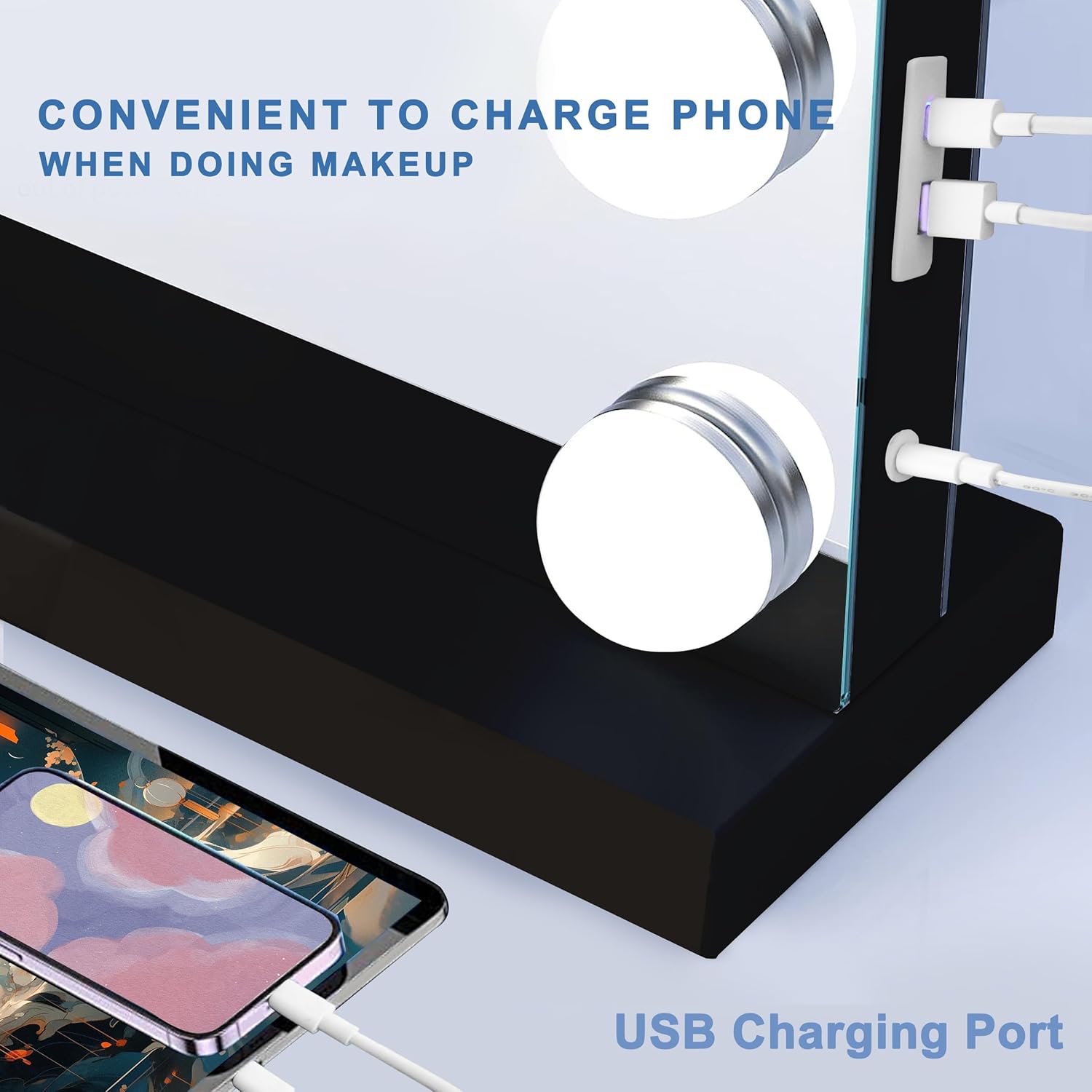 - 【USB Charging Port】 Our vanity mirror has A USB Type C charging port(12V, 1A) on the side of the Hollywood vanity mirror provides convenient charging for your phone/pad.