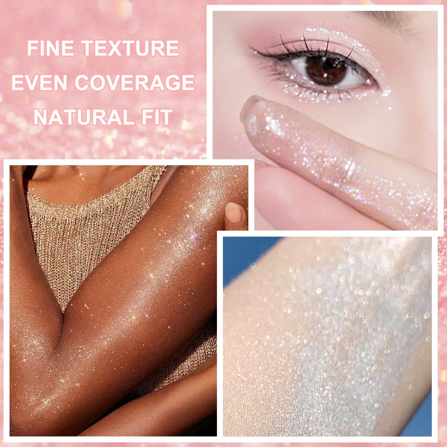 - Glitter Highlighter Powder - The extra finest powder super easy to apply and adheres well to the skin, keep glitter makeup last for hours without greasy, wonโt crease, cake or clog pores, smooth your skin and natural glow like sunshine.