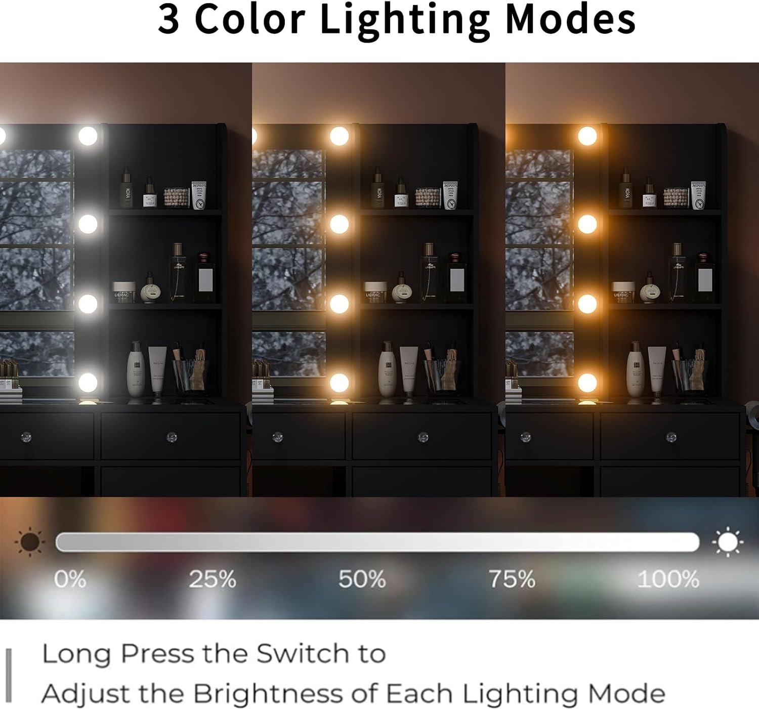- 3 Brilliant Lighting Options: The vanity is equipped with an HD mirror and 10 LED Hollywood plastic bulbs. With 3 color modes(warm/natural/cool) and adjustable brightness, this makeup vanity can meet all your different needs, ideal for home makeup, salon, and live broadcast, you can experience the star-like makeup treatment