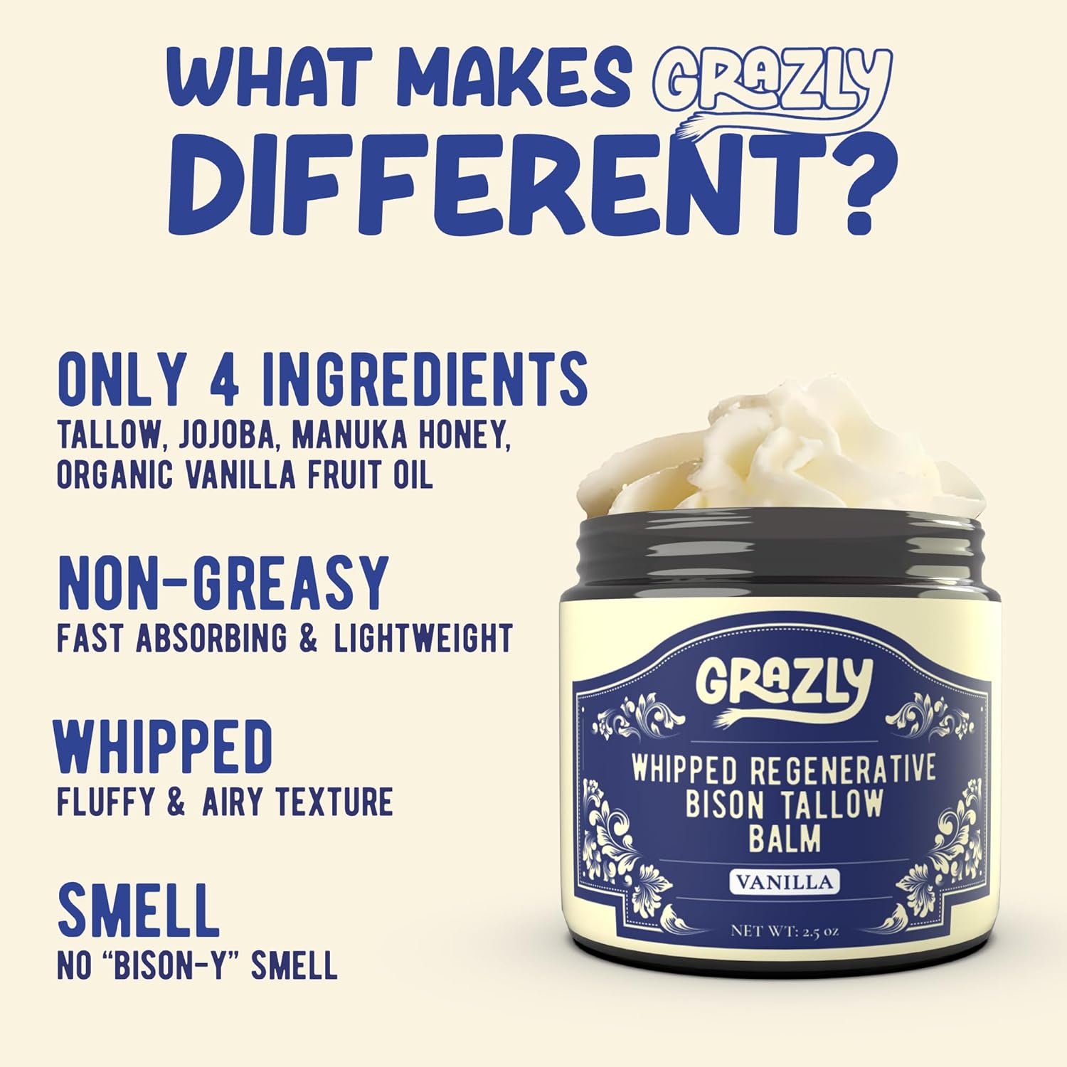 - ORGANIC VANILLA WHIPPED BISON TALLOW BALM FOR SKIN NOURISHMENT: Grazly’s Whipped Bison Tallow Balm combines bison tallow, raw manuka honey, and organic jojoba oil to hydrate and nourish the skin. Infused with a delicate organic vanilla scent, this gentle, non-greasy formula is suitable for all skin types, including sensitive skin. It helps maintain moisture balance, leaving skin soft and smooth, ideal for face and body use.